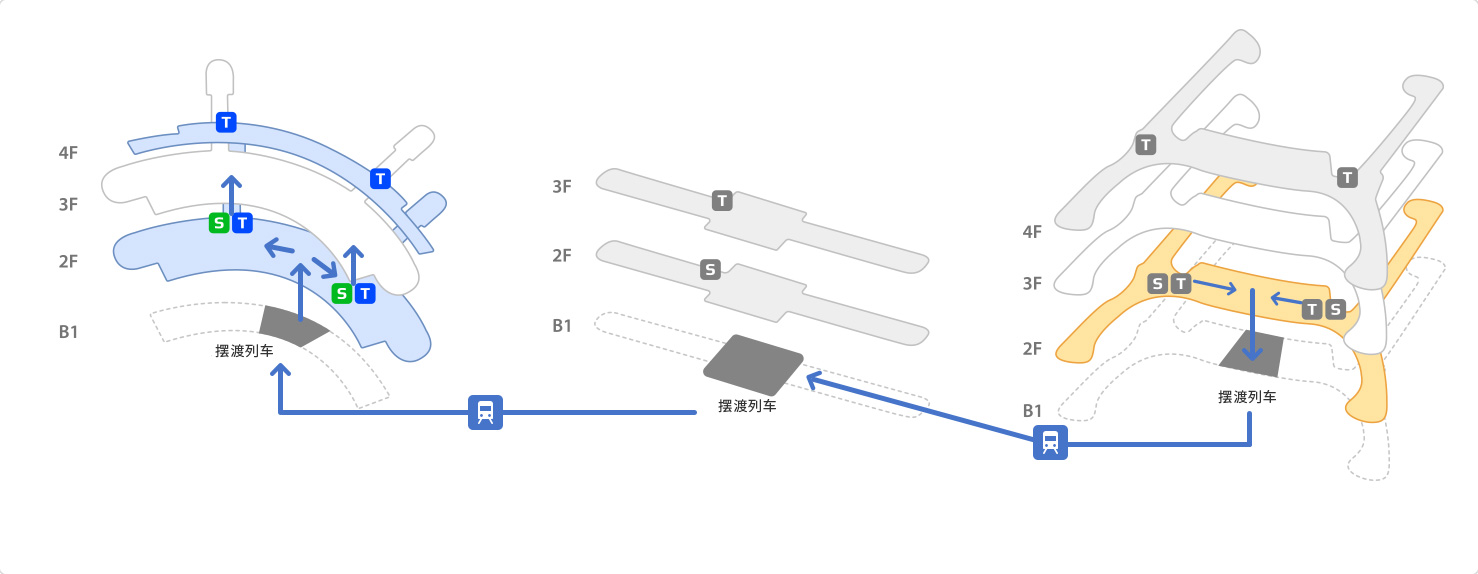 乘坐摆渡列车(B1)开往登机楼的摆渡列车