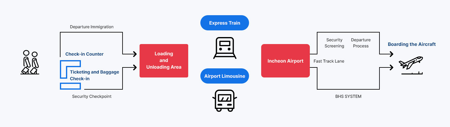 ※ No separate immigration screening for departures is required at the Gwangmyeong Station city airport terminal, as all screenings are conducted at Incheon Airport.