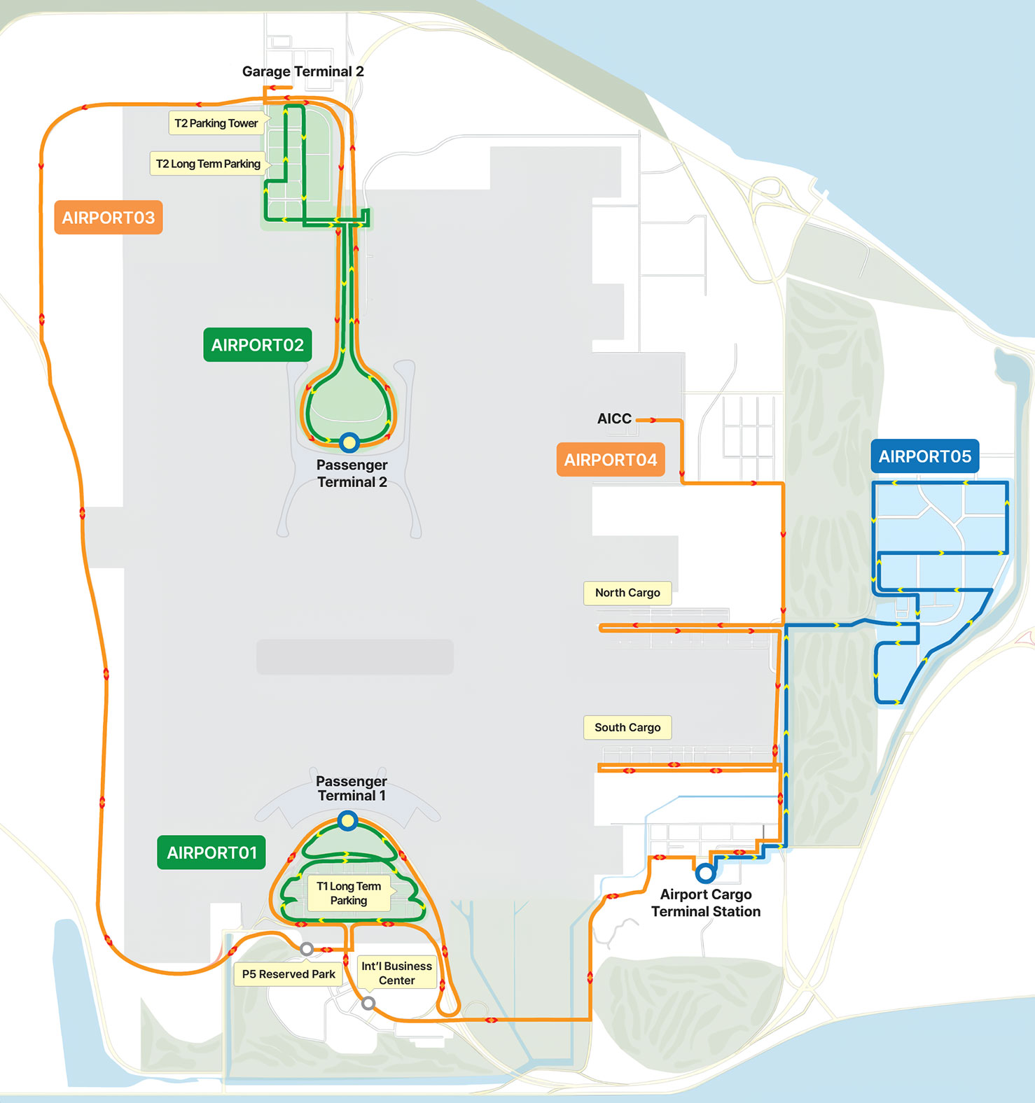 | AIRPORT 03 | Terminal 2 → P5 Reserved Parking → Terminal 1 → Int'l Business Center → Cargo Terminal → AICC | 7–20 minutes | 04:30~23:40 | 70 minutes one way |