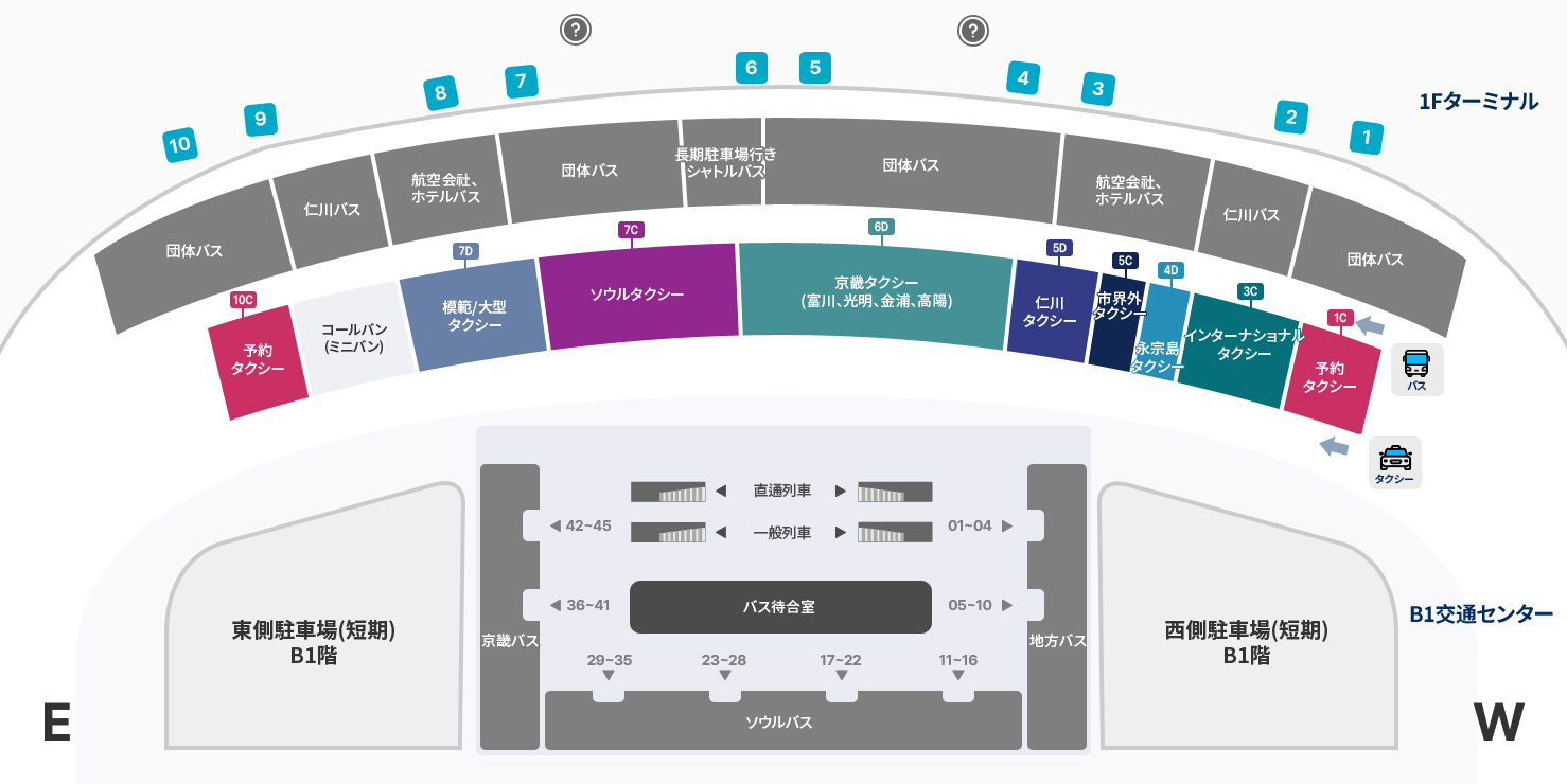 | ターミナル | 区分 | ソウル方面 | 仁川方面 | 京畿方面 | 市外 | 模範タクシー | 大型タクシー |