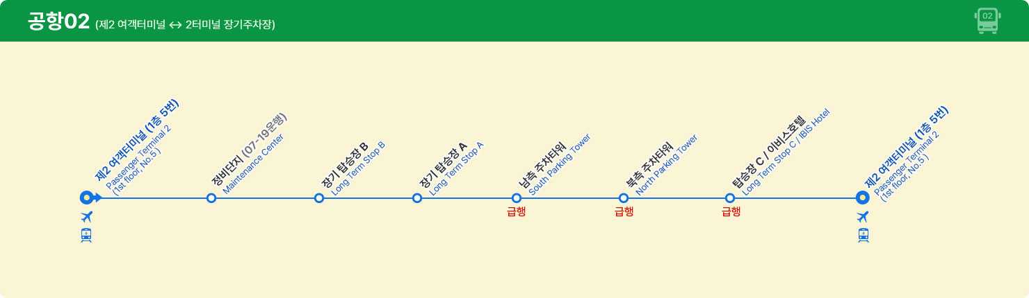 급행노선으로 주차타워-탑승장C-제2여객터미널 3층만 정차 (공항03번 경유)