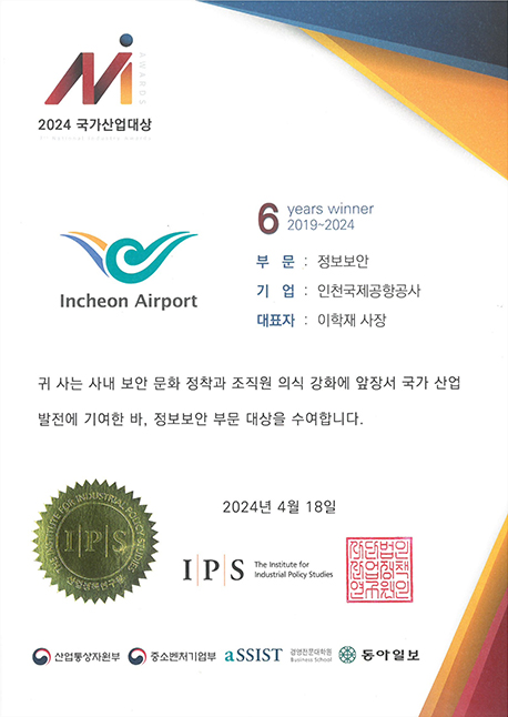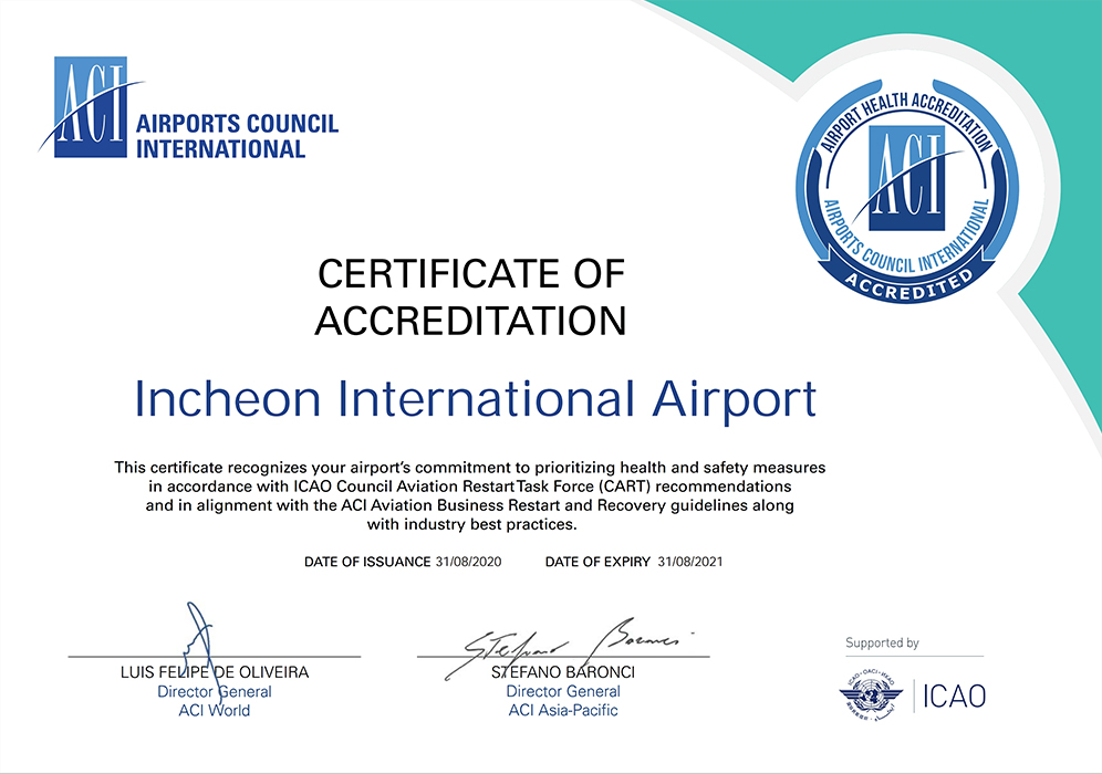 仁川机场于2020年在亚太地区最先获得了由ACI颁发的机场防疫认证(AHA),之后又连续3年获得了再认证,世界级防疫水平得到了认可。 随后,获得了新冠疫情以后新实施的公共卫生安全认证(Public Health & Safety Readiness Accreditation),同时机场应对突发防疫事宜的水平也获得了认可。